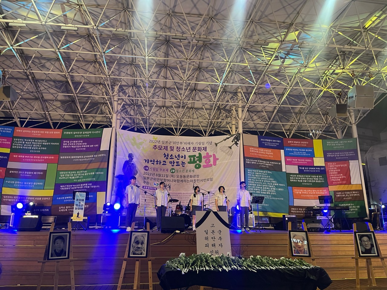 좌충우돌했던 리허설을 뒤로 하고 추모제와 청소년 문화제 본 행사가 이어졌다. ‘청소년이 기억하고 만드는 평화’라는 주제로 열린 2022년 일본군‘위안부’피해자 기림일 행사는 가장 먼저 피해자 영정을 모셨다. 공동협력단체 대표들이 광장 끝에서 대형 위패를 앞세우고 무대를 향해 둥글게 광장을 감싸면서 입장하여 이젤 위에 영정을 올려두었다. 다음 순서로 시민들이 차례로 분향을 한 뒤 주최 단체 대표와 지역 인사의 추모사가 있었다. 추모사는 생존피해자가 없는 시대를 가슴 아파하고 다시는 전쟁이 없는 평화를 향한 다짐이 주를 이루었다. 평화를 향한 다짐은 청소년이 꾸민 문화제를 통해 분출됐다. 밴드 공연, 일제 강점기를 기억하는 1인극, 리코더 연주, 합창, 창작곡 공연, 댄스 등을 선보인 문화제에서 청소년들의 일본군‘위안부’ 역사를 이어가려는 마음을 읽을 수 있었다.