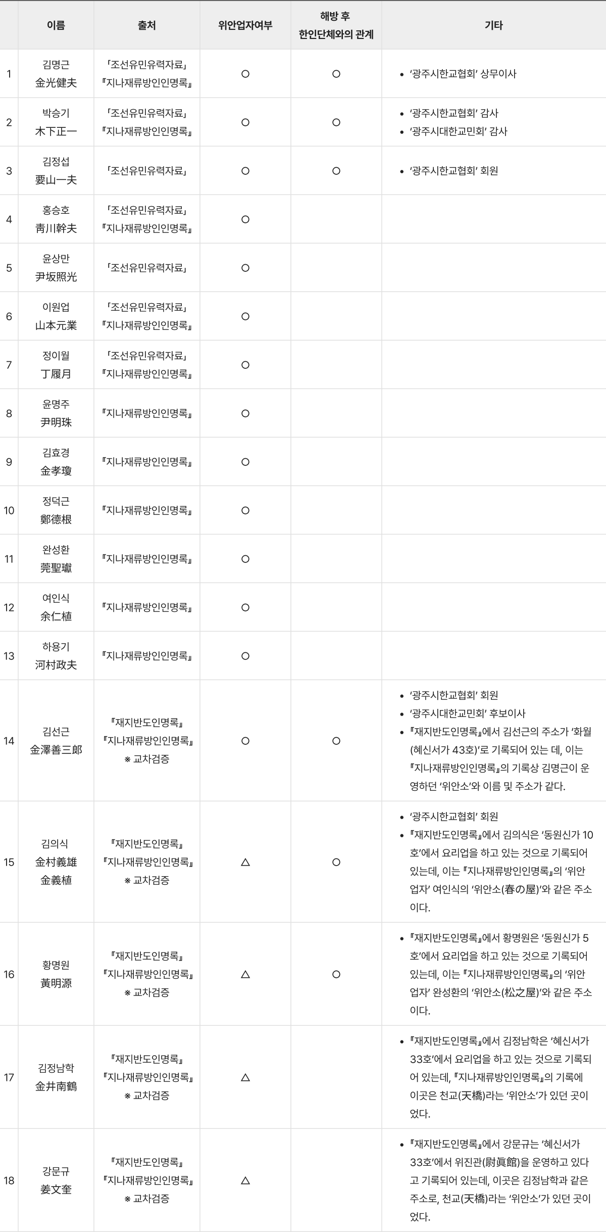 물론 명부에 기록된 여성 중에는 광저우에 체류한 한인 남성들의 가족도 포함되어 있기 때문에 이들 모두를 ‘위안부’ 피해자로 볼 수는 없다. 하지만 1937년 중일전쟁 이후 ‘위안부’ 동원이 급증하였다는 점, 그리고 10대 후반에서 20대 초반까지의 젊은 여성들이 주된 동원 대상이었다는 점, 일본군 점령지인 광저우 지역에 수백명의 한인 여성들이 갈 이유가 없었으며, 일본군의 허가나 도항증명서 없이는 진입도 불가능했다는 점, 수백 명의 젊은 한인 여성들이 일본군 점령지역에서 할 수 있는 일은 ‘위안부’ 외에는 거의 없었고 다른 기록도 없다는 점, 『광주시대한교민회회원명부』 속 여성들의 직업이 ‘여급’으로 기록되어 있었다는 점, 그리고 한인단체를 설립하고 명부 작성을 주도한 이들이 ‘위안소’ 업자들이었다는 점 등을 고려할 때, 두 명부에 기록된 여성들의 상당수는 이들이 운영하던 ‘위안소’에 있었던 피해자로 보는 것이 합리적이다.