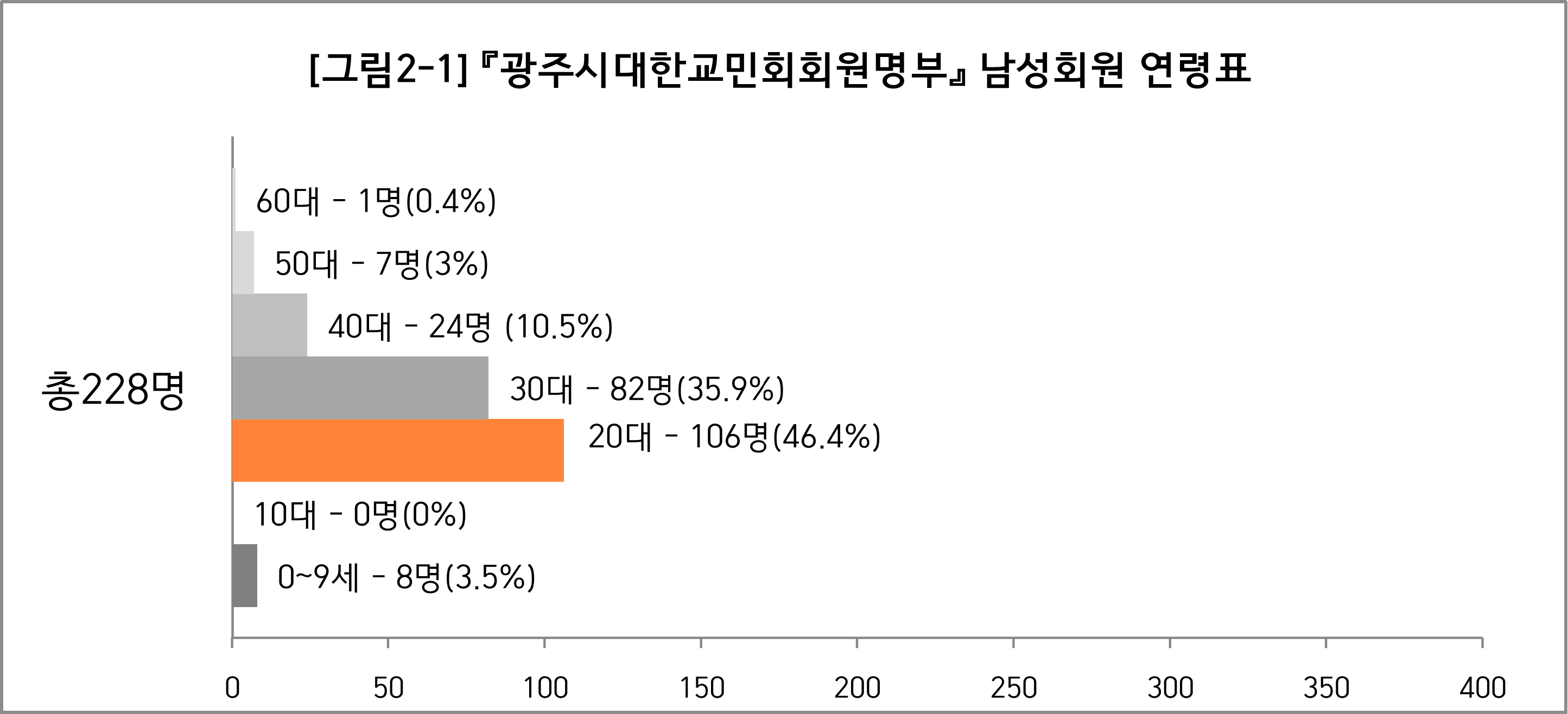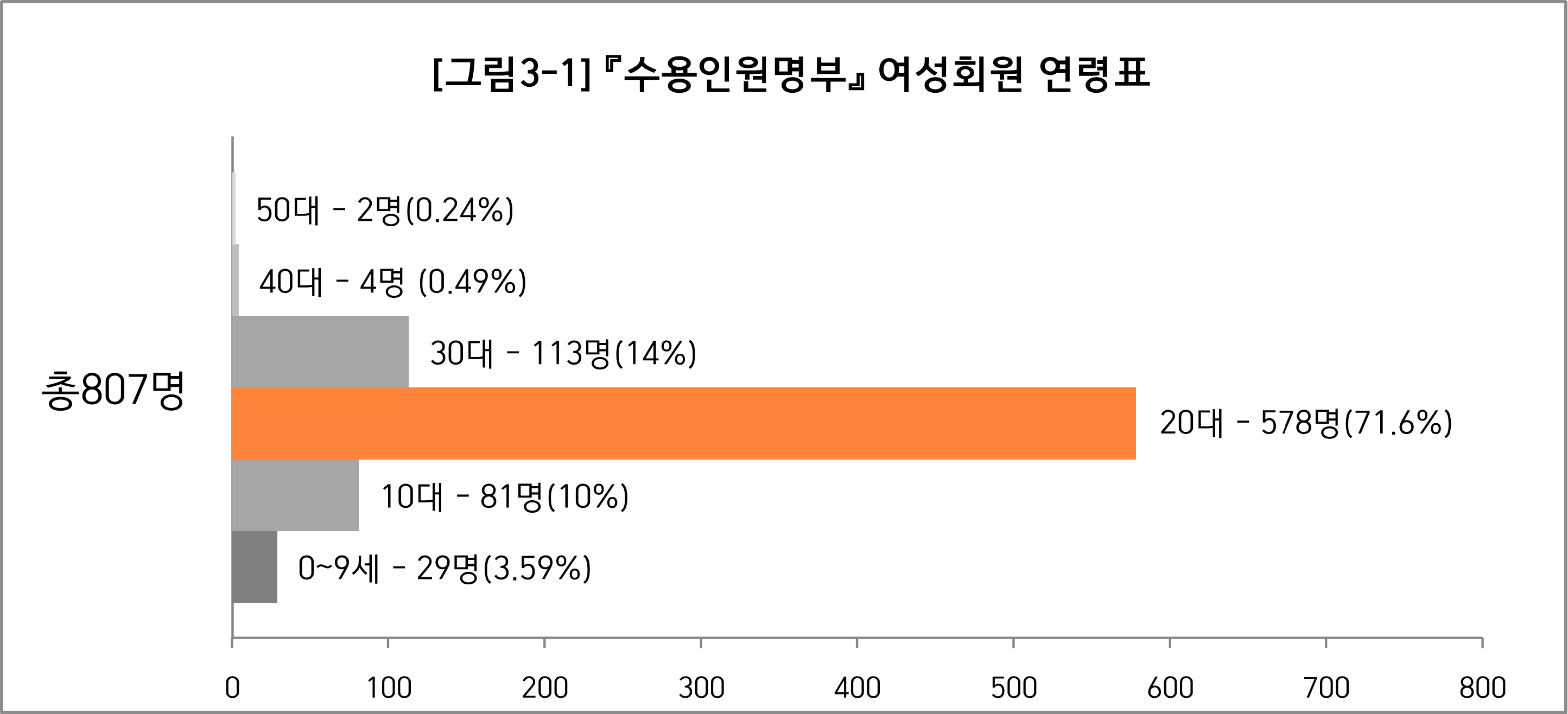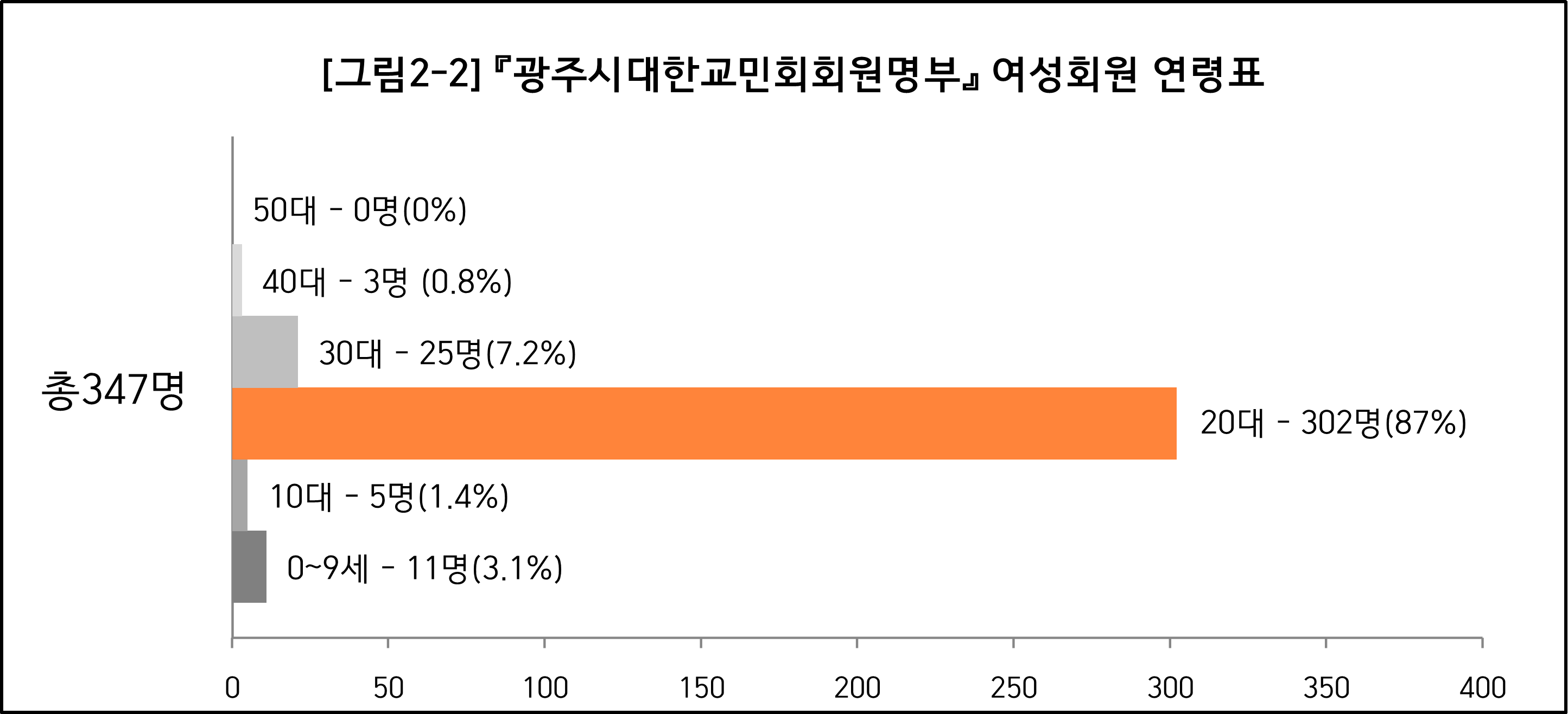 위 그림과 같이 『광주시한교협회회원명부』와 『광주시대한교민회회원명부』 남성들의 연령은 20대, 30대, 40대 이상까지 비교적 고르게 분포되어 있다. 반면 여성들은 『광주시한교협회회원명부』에는 85.4%, 『광주시대한교민회회원명부』에는 87%가 20대로, 젊은 여성들의 비중이 압도적인 다수를 차지하고 있었다. 이같은 경향은 상해 『수용인원명부』와도 일치한다. 이는 해방 직후 광저우의 한인 여성 대부분이 매우 젊은 연령대였음을 보여주는 것으로, 당시 일본군의 ‘위안부’ 동원 대상이 젊은 여성층에 집중되었던 역사적 사실과도 부합한다.