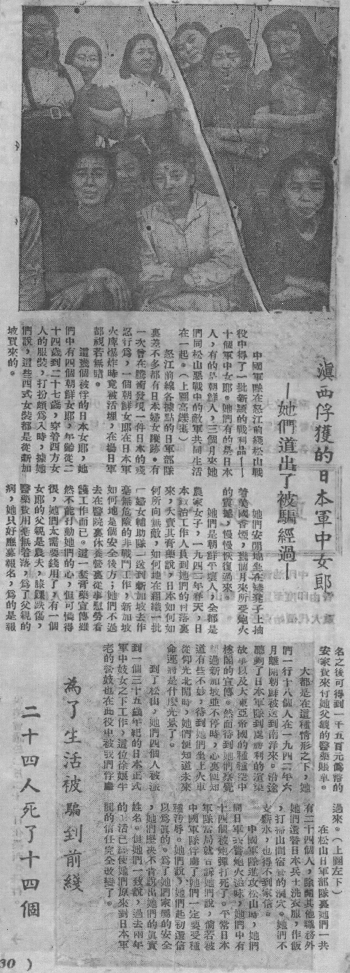 기사에 따르면 1942년 봄, 일본인들은 여성들이 살고 있는 마을을 찾아가 싱가포르에서 일본군을 돕는 일을 하는 ‘여성 보조 부대(妇女辅助队)’를 모집한다고 속였다. 안전하고 돈을 벌 수 있다는 말에 가난한 농가 출신 소녀들은 가족을 부양할 수 있는 기회라고 생각해 쉽게 현혹되었다. 그들은 일본인의 말을 믿고 지원하여 배에 올랐고, 남양에서 행복한 삶을 꿈꾸었다. 하지만 그들이 도착한 곳은 싱가포르가 아닌 미얀마였고, 기다리고 있는 것은 안전한 일자리가 아니라 일본군의 폭력이었다. 마지막에 그들은 윈난성 쑹산의 일본군 진지로 보내져 유린당했다. 중국군이 쑹산을 점령했을 당시 원래 24명이던 ‘위안부’ 가운데 살아남은 여성은 열 명이었다.